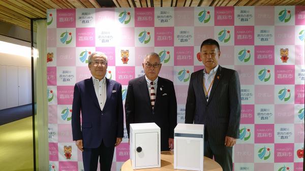 嘉麻市役所の新庁舎建設に伴い、嘉麻市誘致企業振興会より、記念品(本庁舎1階 情報コーナー用の棚、案内板・パブリックコメント用の投函箱)を贈呈していただきました。